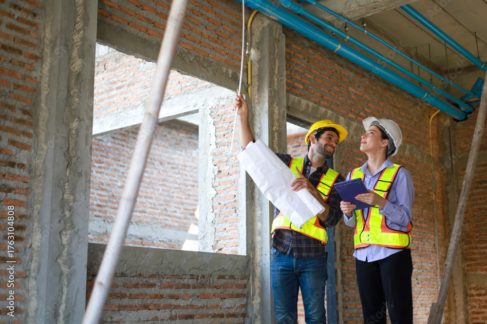 Male and female engineers discuss, inspect, and construct houses in the village. They are responsible for internal work and construct houses according to standards and in accordance with the design.
