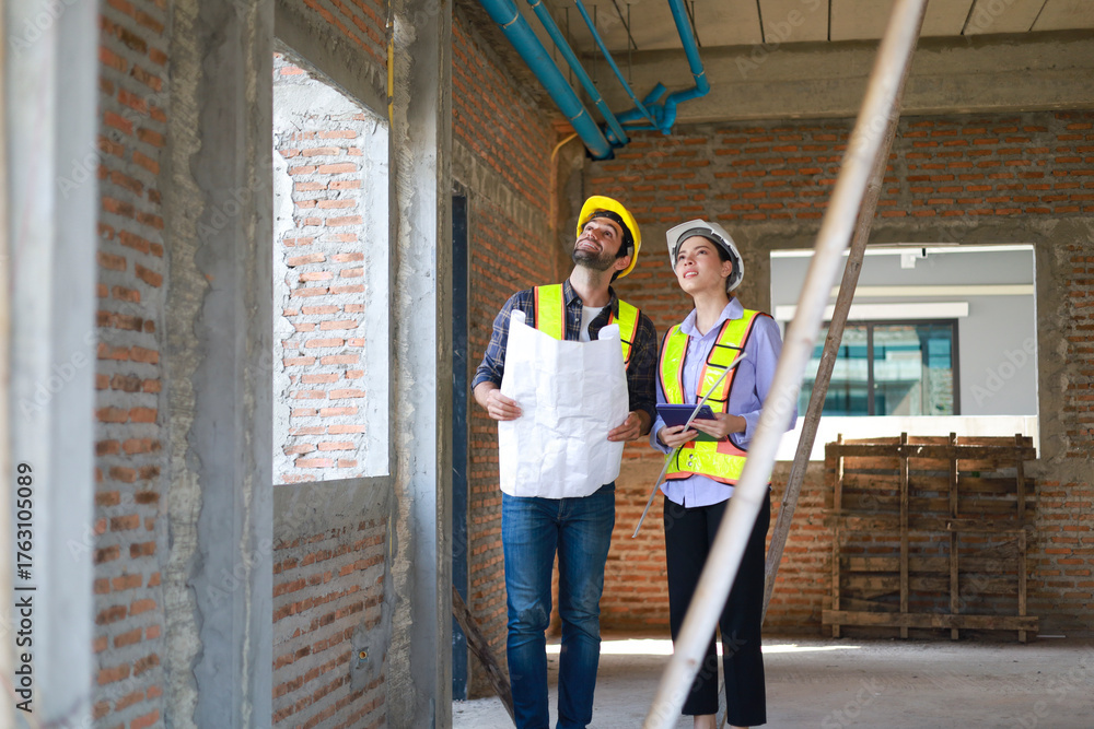 Male and female engineers discuss, inspect, and construct houses in the village. They are responsible for internal work and construct houses according to standards and in accordance with the design.