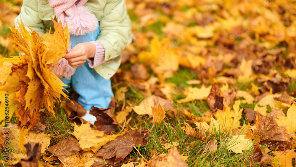 child collecting yellow autumn leaves outdoors, dressed warmly in jacket and scarf. seasonal activity highlights fall colors and nature interaction in park or garden setting.