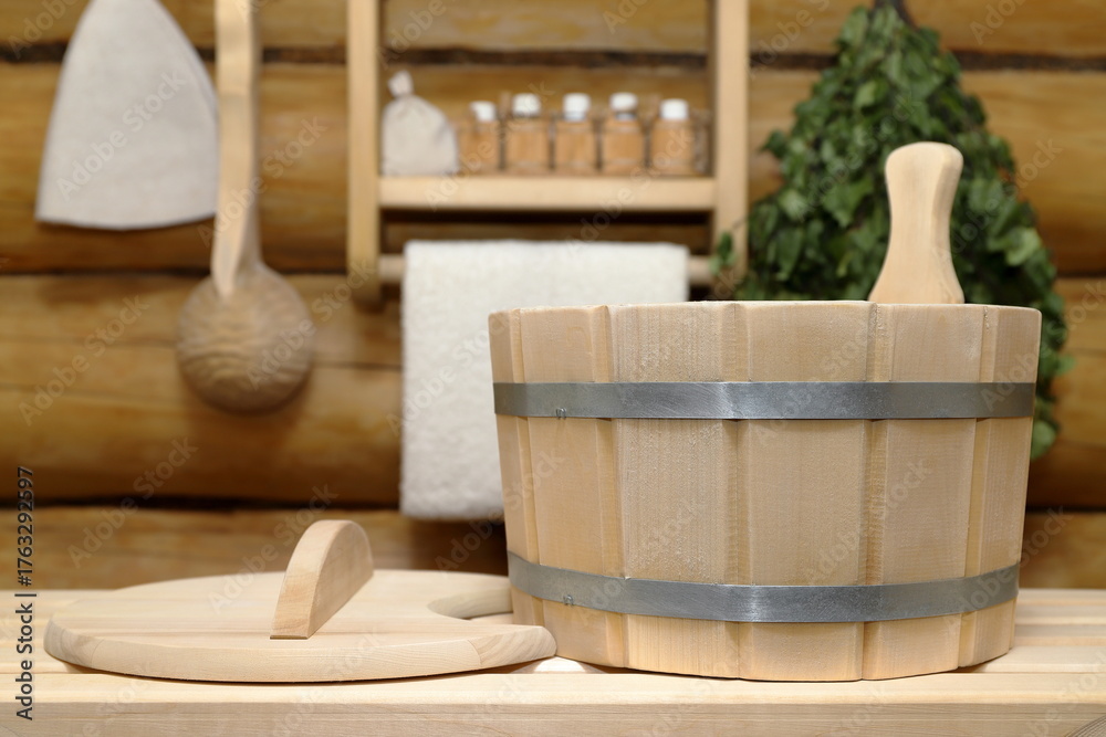 In the sauna interior on a plank bench against a log wall with dry birch broom, ladle, a hat and a shelf with set of aroma oil bottles and a towel there is a wooden vat for sauna and bath treatments.