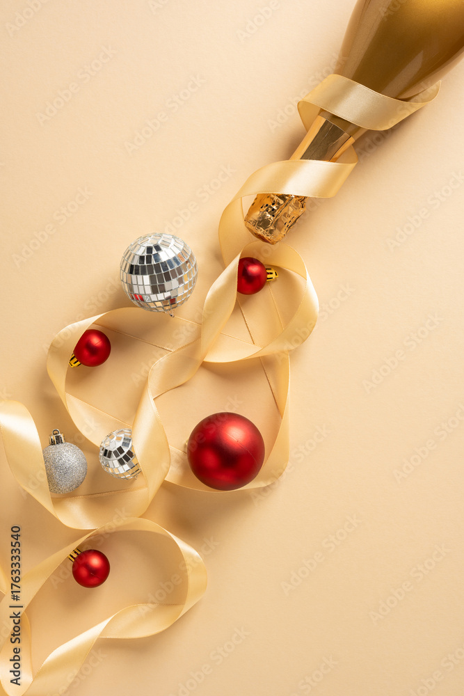 Vertical scene of festive decor featuring a champagne bottle, satin ribbon, silver disco balls and red ornaments, a warm gold background sets a stylish mood for Christmas and New Year celebrations