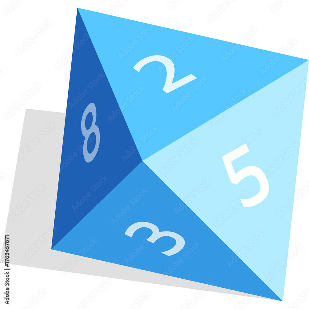 A blue 20-sided die with white numbers showing facing up with a slight shadow beneath it on a transparent background