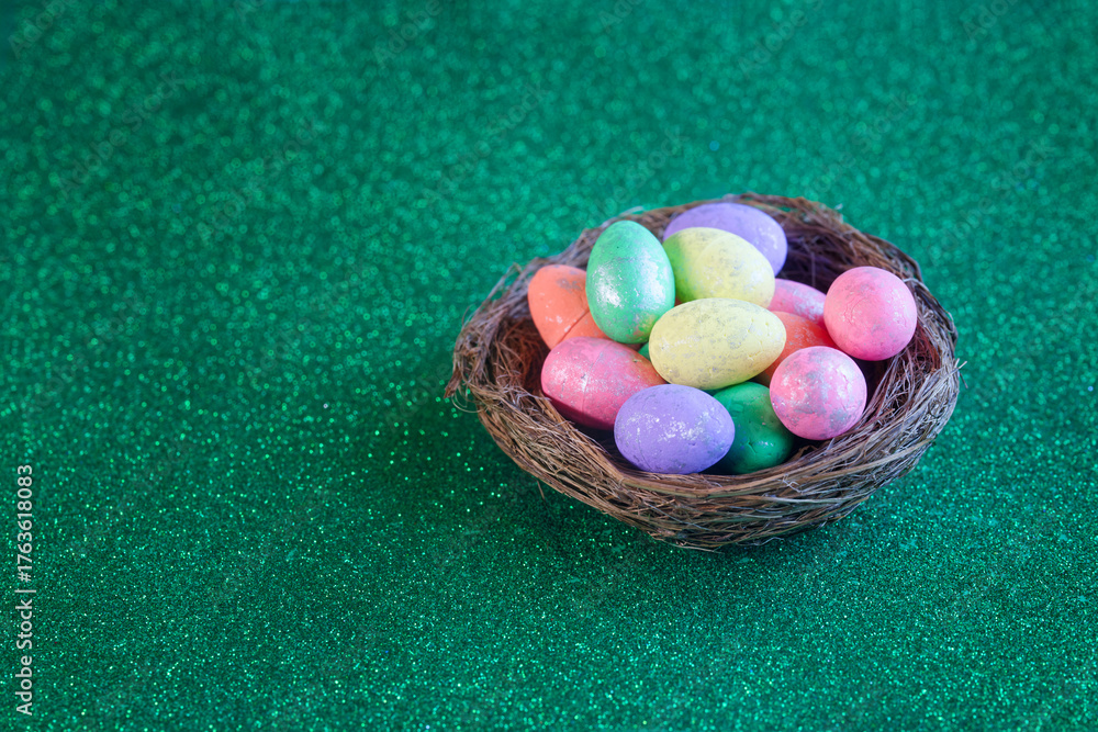 Colorful pastel Easter eggs in a rustic bird nest on a sparkling green background, with wide copy space for text and greetings. Bright spring holiday layout. Photo