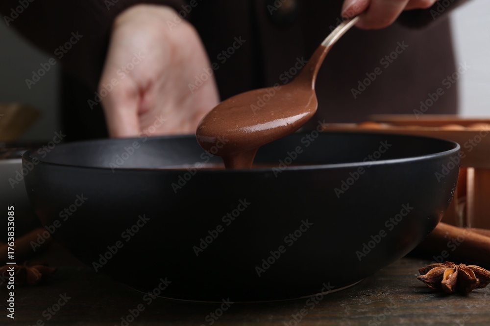 Woman mixing liquid chocolate dough with spoon in bowl at wooden table, closeup