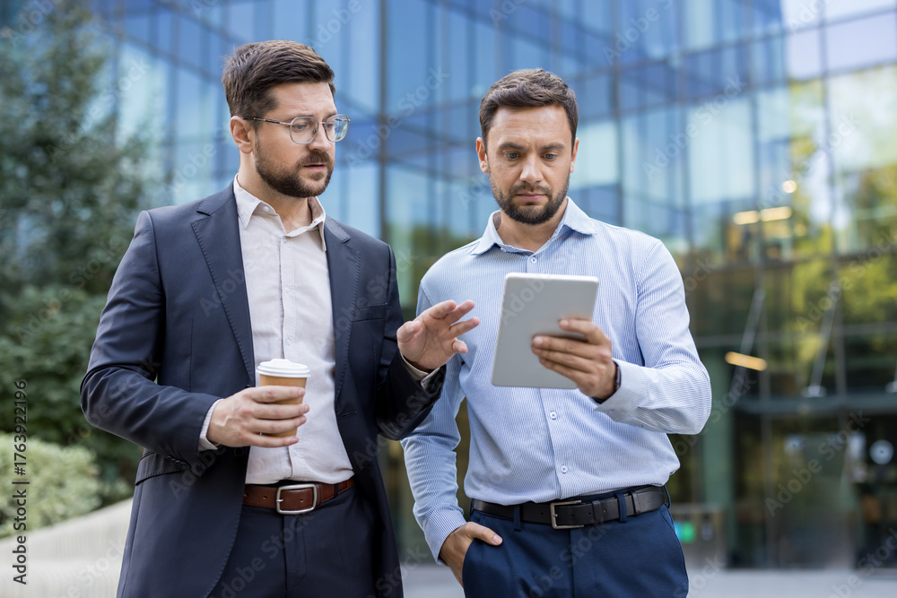 Two businessmen colleagues discussing digital data on a tablet device, standing outdoors with a corporate building and green foliage in the background, one man holding a coffee