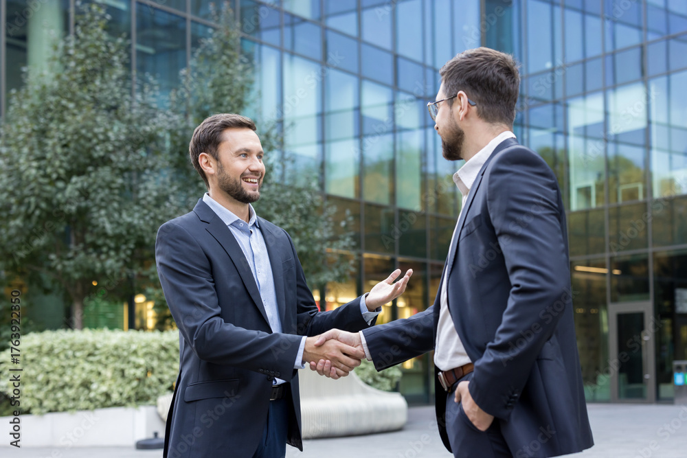 Two smiling businessmen shake hands outdoors in front of a modern corporate building, sealing a successful deal and celebrating a new partnership with confidence and mutual trust