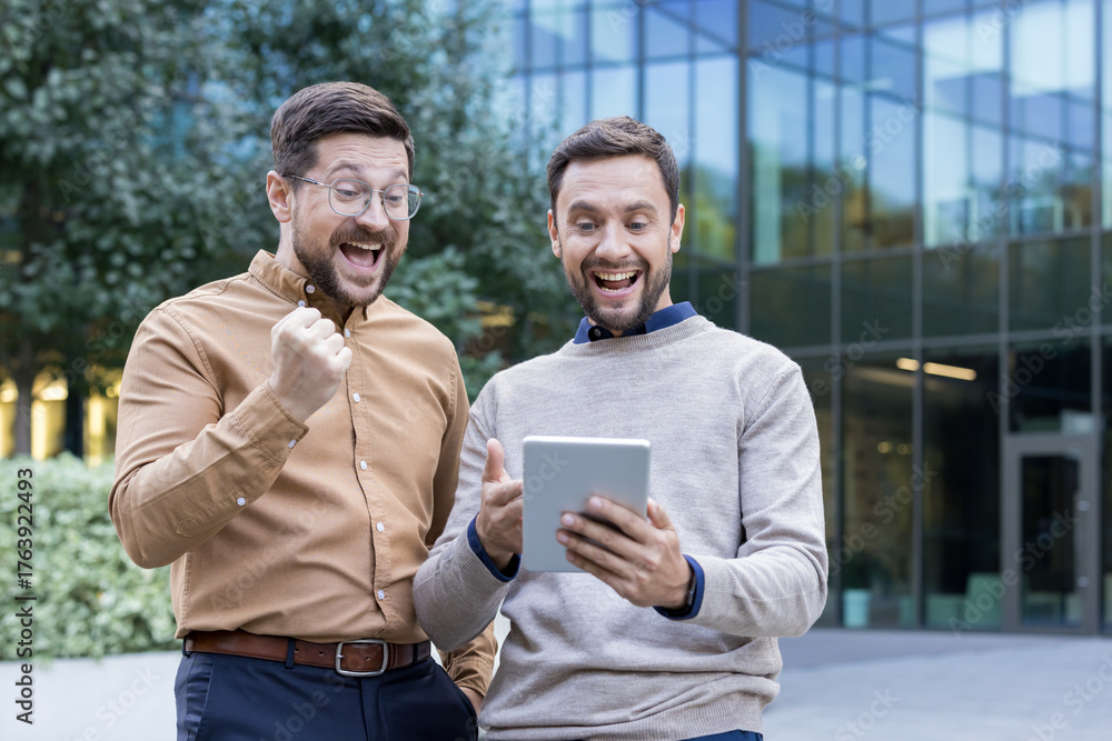 Two excited business colleagues celebrating triumph, looking at a digital tablet outdoors, standing in front of a modern glass building, expressing success and joy