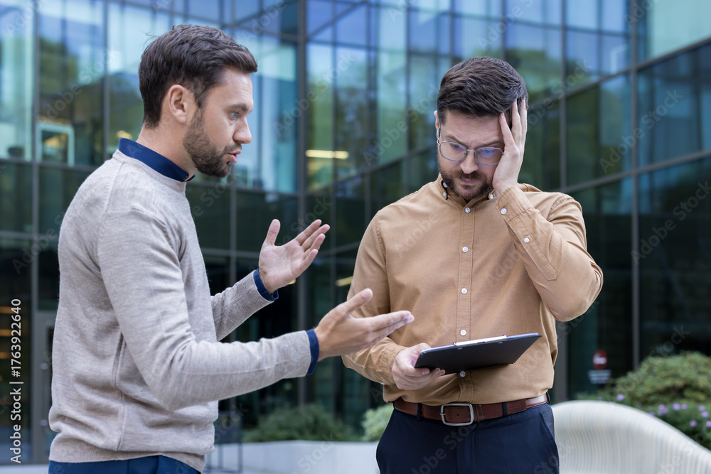 Two stressed businessmen arguing about business while looking at a clipboard outside a modern office building, symbolizing conflict, dispute, and pressure in a corporate environment