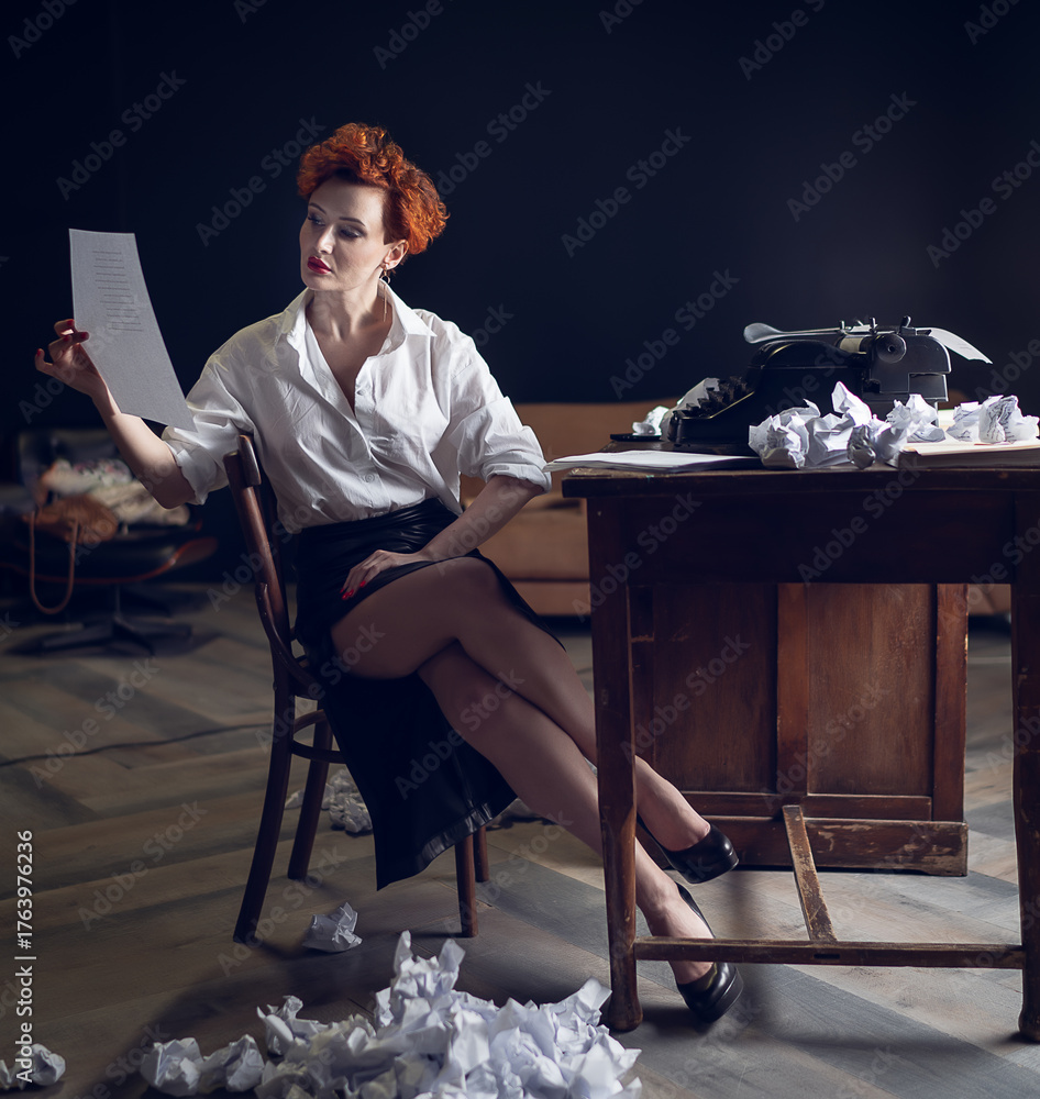 red-haired Woman Writer in a Dramatic Setting with Vintage Typewriter and Crumpled Papers