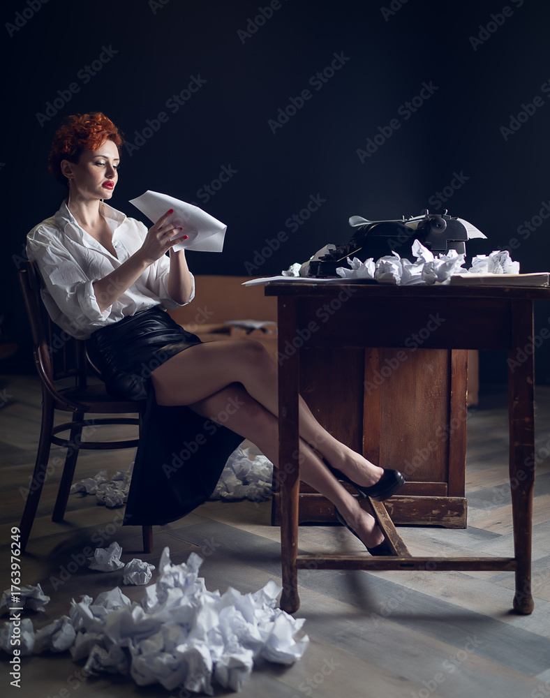red-haired Woman Writer in a Dramatic Setting with Vintage Typewriter and Crumpled Papers