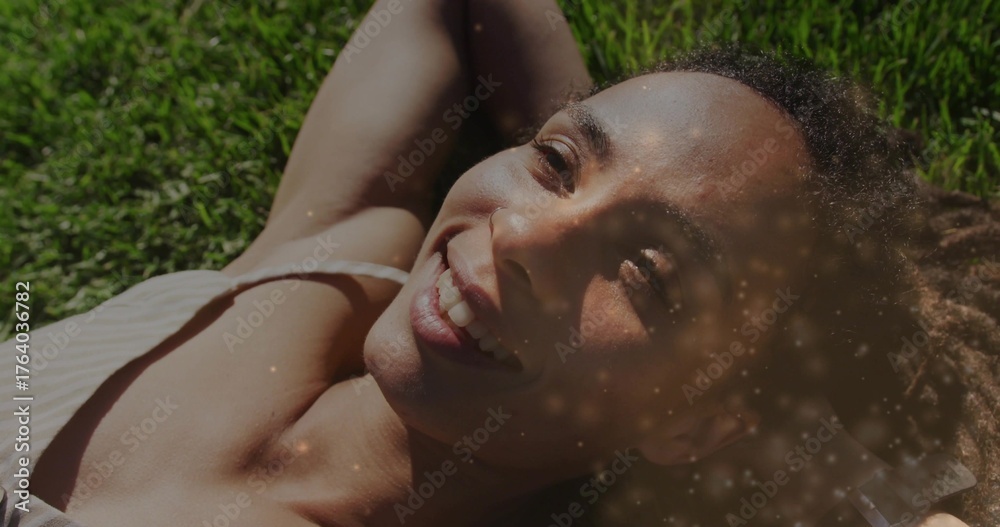 Smiling woman reclining on lawn at park, wearing striped tank top with golden sparkles overlaying