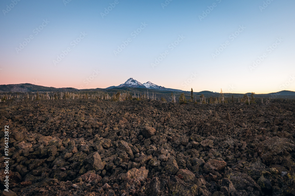 Rocky lava fields by a beautiful mountain view