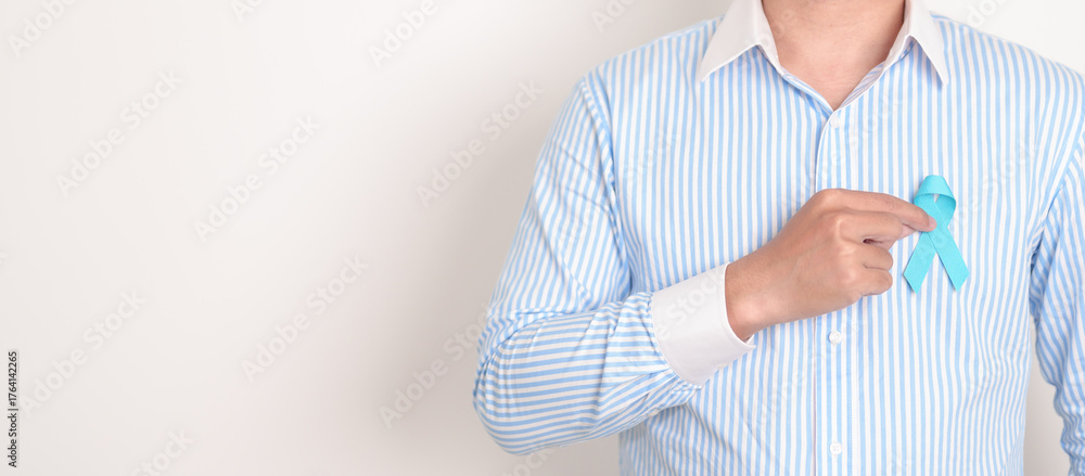 Man with blue Ribbon for concept of blue November, November Prostate Cancer Awareness month, World Diabetes day , Men Health month, International men, Father day. Healthcare and world cancer day