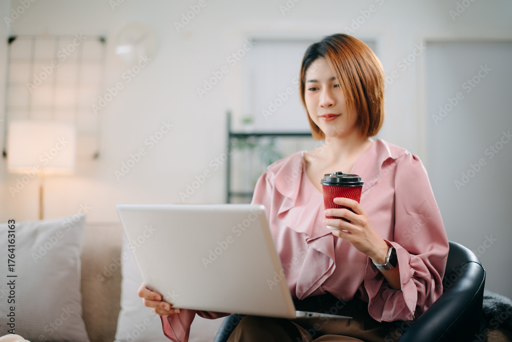Young woman sits comfortably on a sofa, reading a notebook while holding a coffee cup.