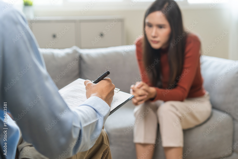 Psychology, depression. Suffer asian young woman consultation with psychologist while patient counseling mental therapy, doctor hand taking notes at clinic. Psychologist with sick mental health person