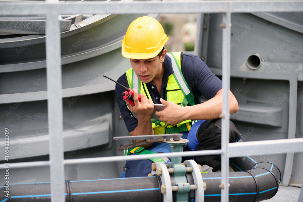 A construction worker at a facility, wearing safety equipment and talking on walkie talkie in the factory