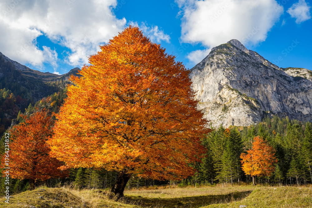 Beautiful European beech trees (Fagus sylvatica) illuminated by the sun in autumn, recognizable by its bright orange-yellow color. Indian summer in the Karwendel, Austria