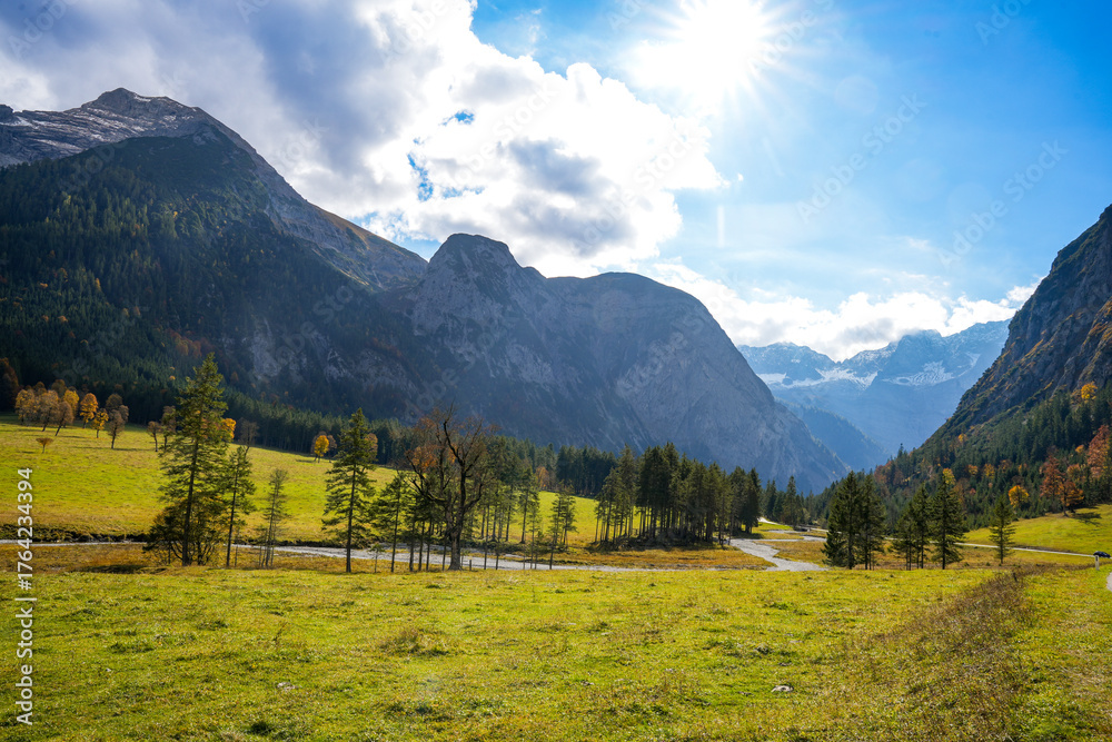 A paved road leads through the Großer Ahornboden. This is a high plateau in the Eng, the rearmost part of the Tyrolean Rist Valley. Mountain panorama in the Karwendel, Austria