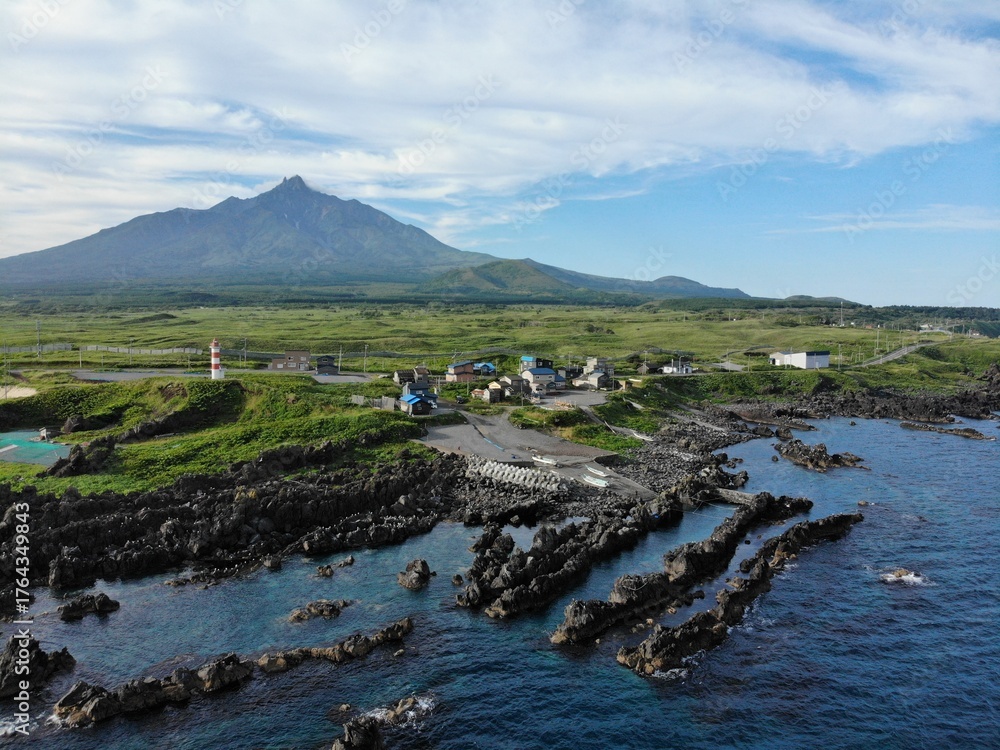 Coastal village and lighthouse beneath Mount Rishiri, rugged basalt reefs and blue Sea of Japan, Rishiri Island, Hokkaido, Japan — aerial drone view