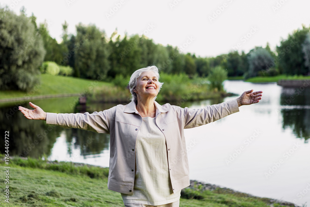 Happy senior woman raising arms up in green nature and lake. Beautiful 60 years old female enjoying freedom and positive emotions outdoors, celebrating life, health and wellbeing during travel