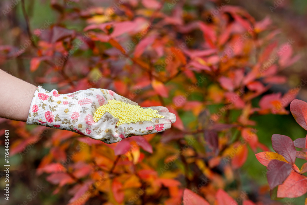 Blueberry Plant Soil Acidifier Fertilizer. Sulfur Granules Acidity for Soil ph Blueberries in Autumn.