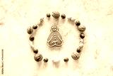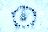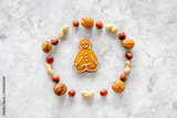 Healthy food for sportsman. Cookies in shape of yoga asanas near nuts on stone background top view mockup