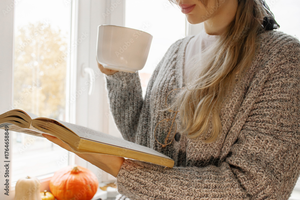 Woman in chunky gray cardigan reading a book and holding a cup of hot tea or coffee by a window with pumpkins on the sill. Cozy autumn lifestyle image for wellness, decor, editorial, and marketing use
