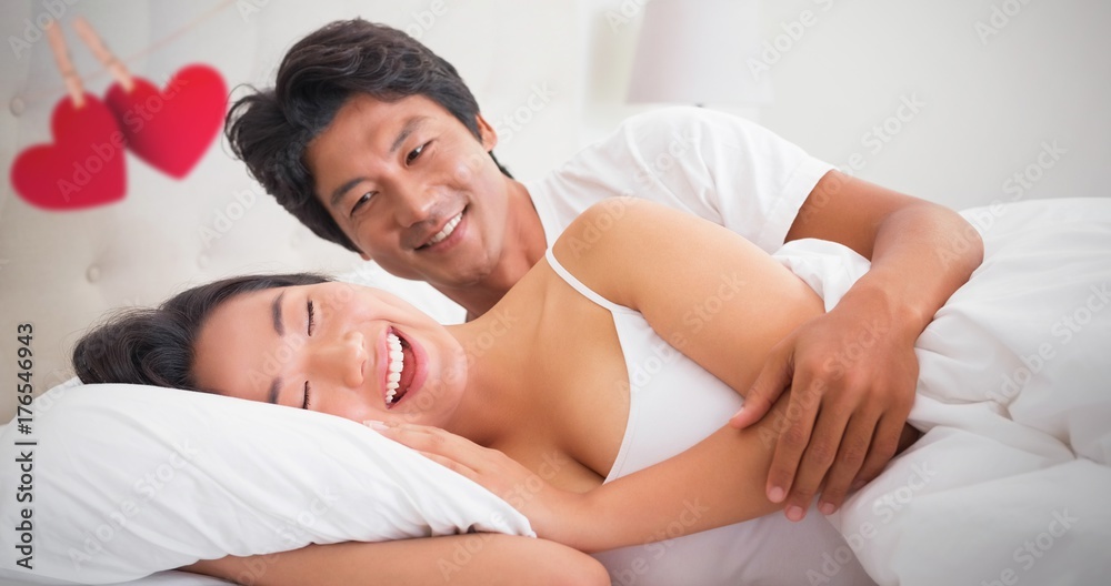 Composite image of hearts hanging on a line