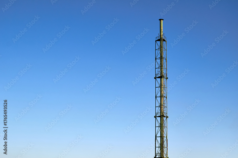 Tall industrial chimney rise into cloudless blue sky with metallic structures. Minimalism horizontal background with copy space.