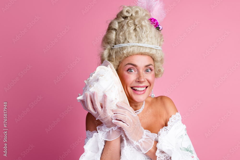 Cheerful lady in ornate baroque costume with curly wig posing on pink background accentuating an elegant historic fashion concept