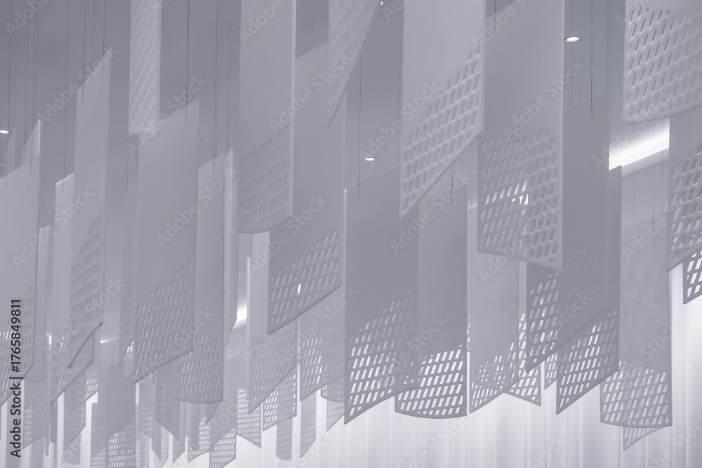 a series of geometric, lattice-patterned paper lanterns hanging from the ceiling. The lanterns are rectangular with a grid-like design, casting intricate shadows on a white, softly lit background