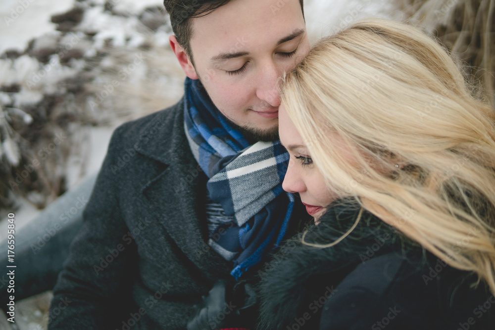 Glückliches Paar in Winterlandschaft sitzt auf Parkbank
