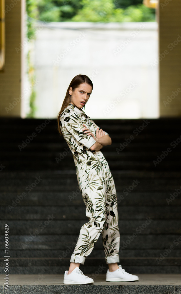 Young girl in the street with unhappy face. Pretty woman in fashionable overalls.