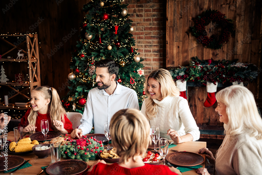Family Christmas dinner around a warm festive table beside a decorated Christmas tree and cozy living room