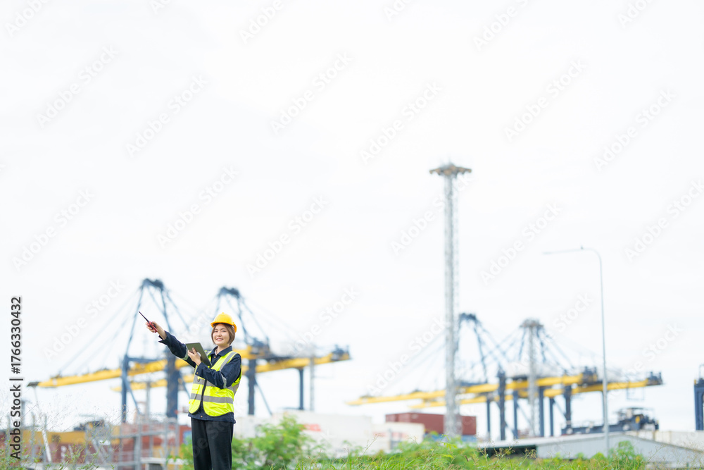 At the busy port, a female engineer collaborates with her company’s logistics team to review business efficiency, inspect machinery, and improve industrial workflow.