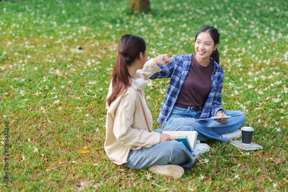 Asian female students fist bumping celebrating success