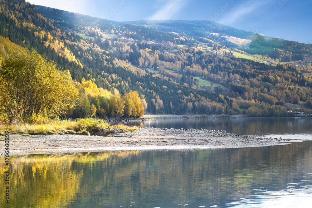 Autumn landscape with colorful forest on the lake shore and mountain backdrop.