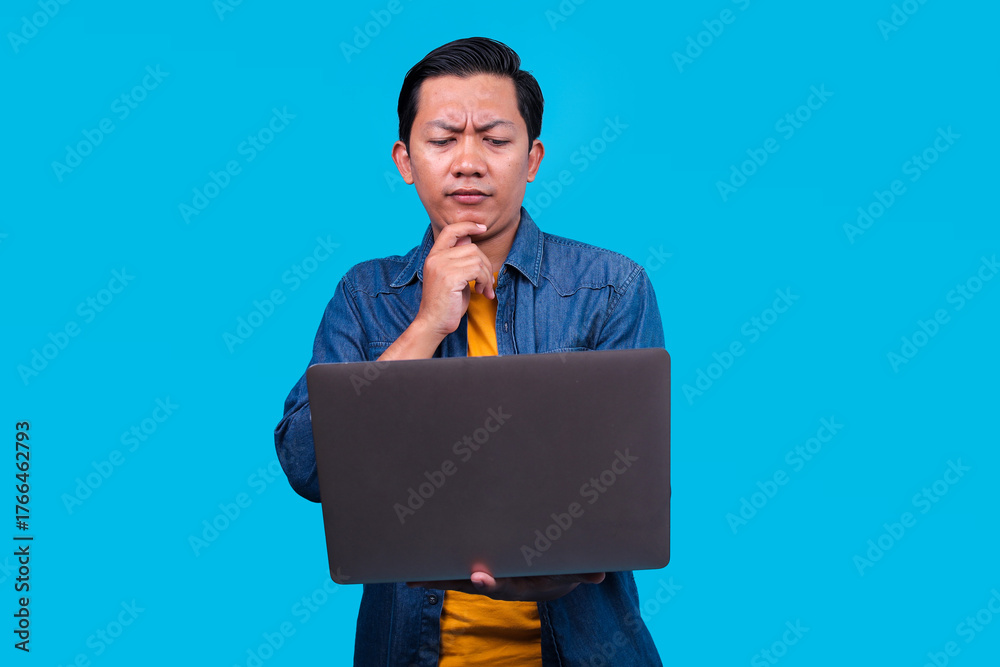 Pensive Young Asian Man Using Laptop Computer And Thinking Deeply Isolated On Blue Background