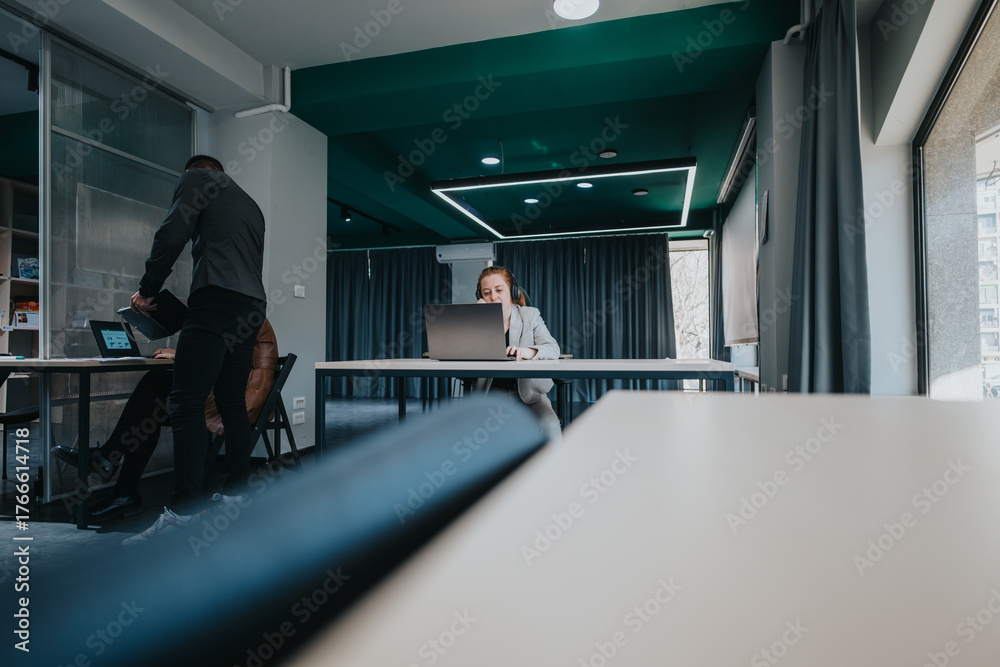 A vibrant workspace featuring people working on laptops in a modern office setting. The scene highlights collaboration and professionalism with a focus on dynamic lighting and open design.