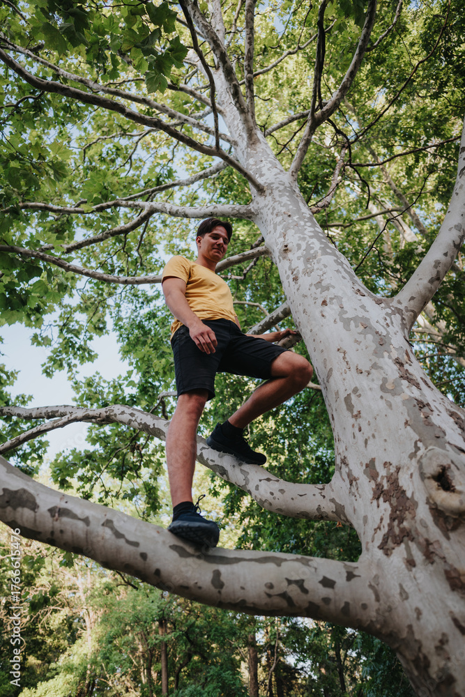 A man wearing a yellow shirt and black shorts climbs a wide tree in a green park. The moment captures outdoor fitness, balance, and adventure amid leafy branches.