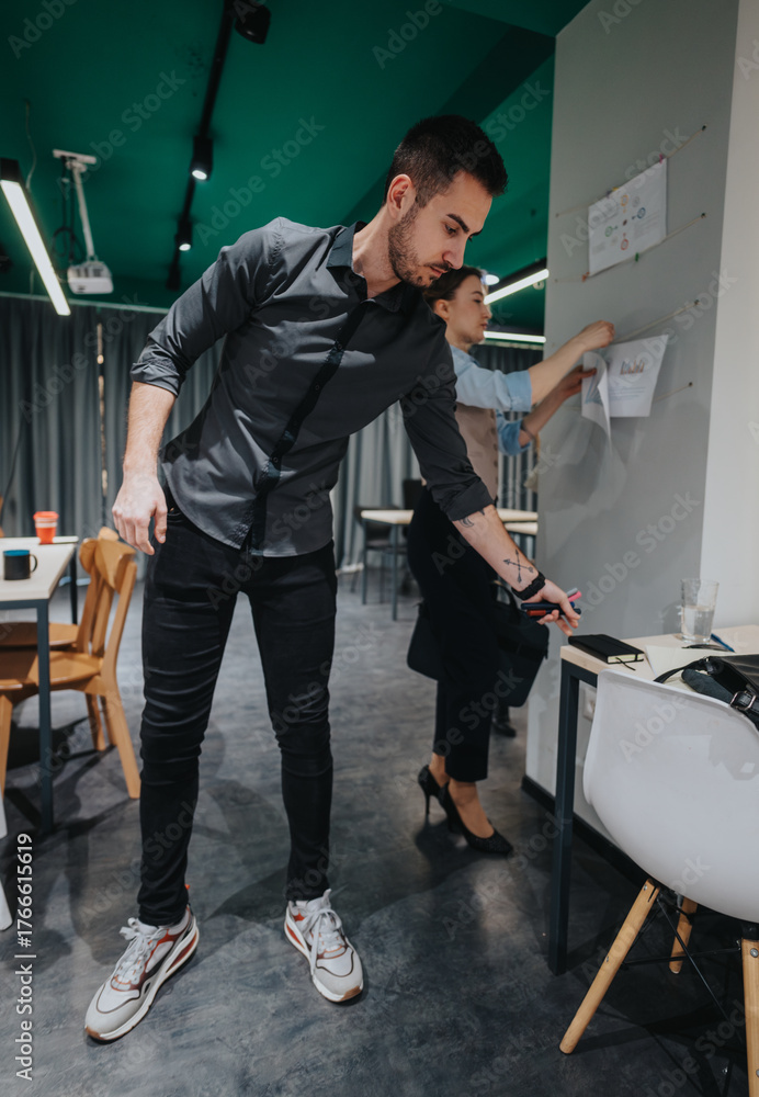 Business team members actively collaborate in an office setting, brainstorming and discussing ideas for a project, signifying teamwork, creativity, and productivity in a vibrant and modern workspace