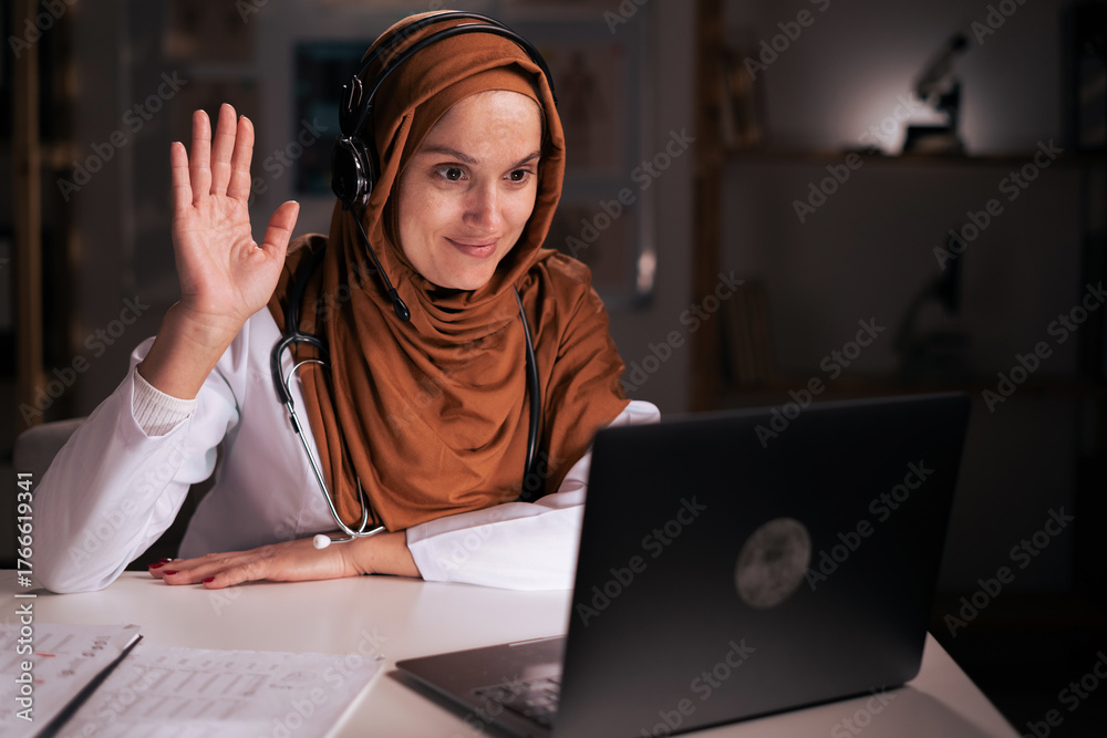Muslim female doctor waving hand on video call looking on laptop screen, patient consulting remotely on night shift in hospital . Telemedicine concept