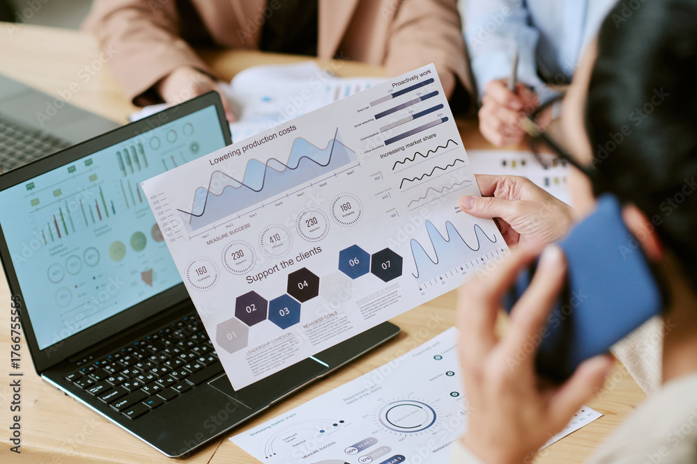 Asian young adult woman holding printed business analytics report while talking on smartphone, sitting at desk with open laptop displaying charts, collaborating with colleagues during meeting