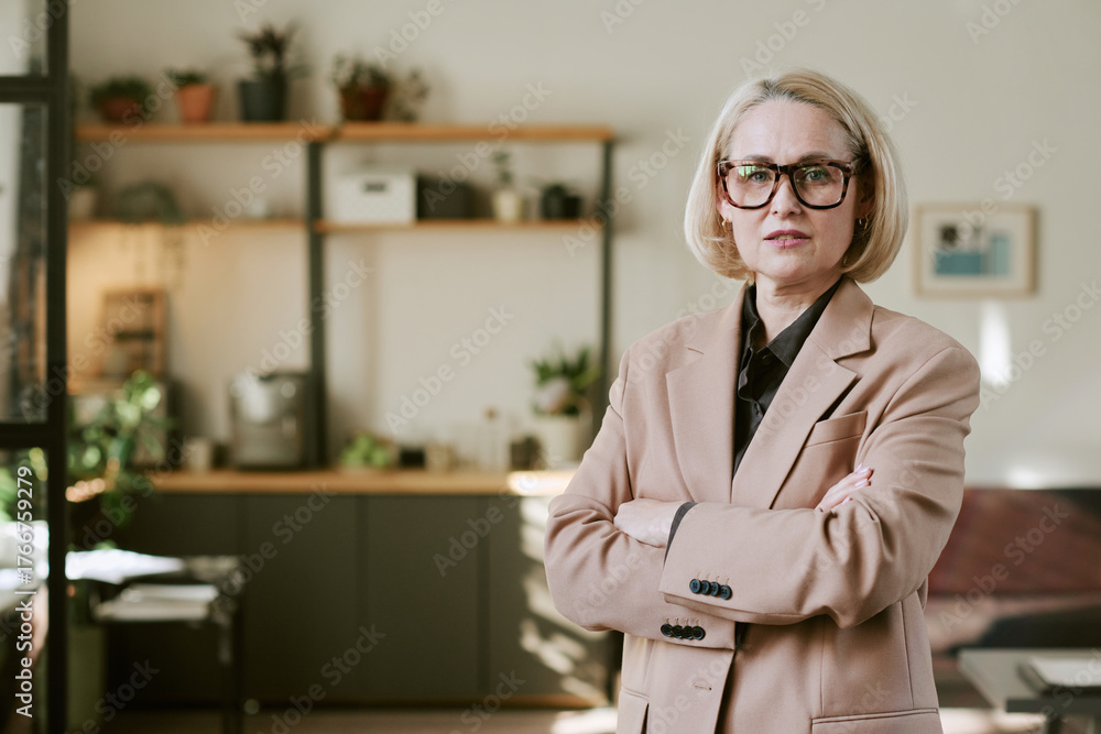 Portrait of middle aged Caucasian woman with blond hair and glasses standing with arms crossed in modern office space, looking confidently at camera, plants and shelves in background