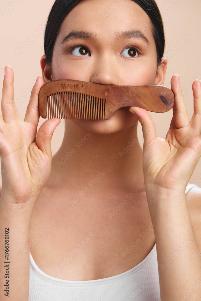 asian woman holds a wooden comb near her face in a closeup portrait, playful expression, soft lighting and simple background creating a casual fashion mood.