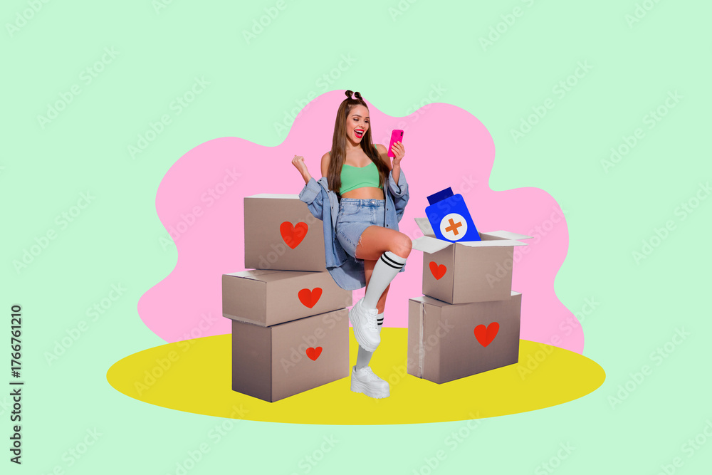 Collage of young woman man toward donation jar with hearts symbolizing charity blood donor day volunteer support