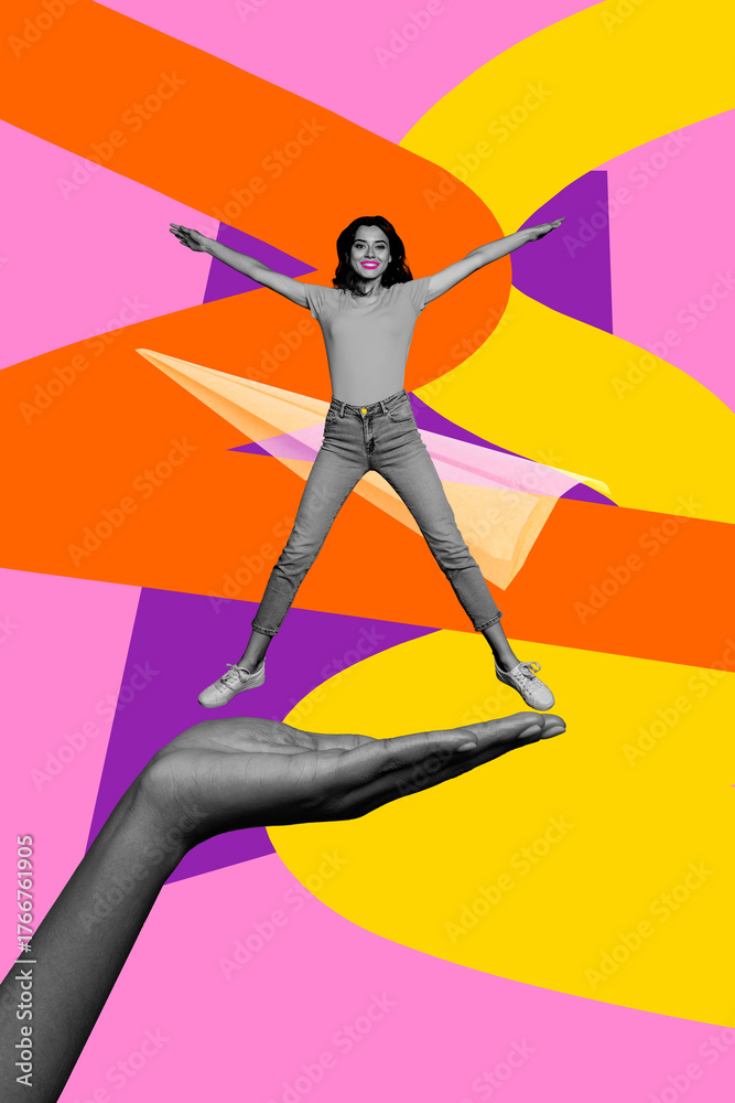 Banner image poster collage of happy girl jump human palm dance friday mood paper plane icon disco celebration weekend chill