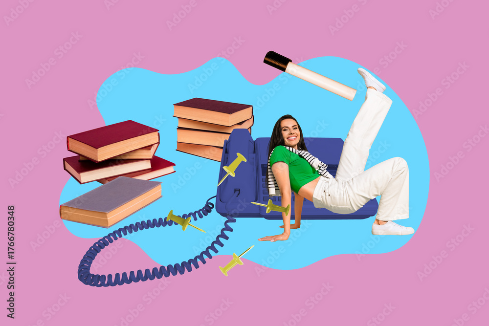 Collage showing a person sitting on old telephone with book symbolizing outdated tools in modern office work or study