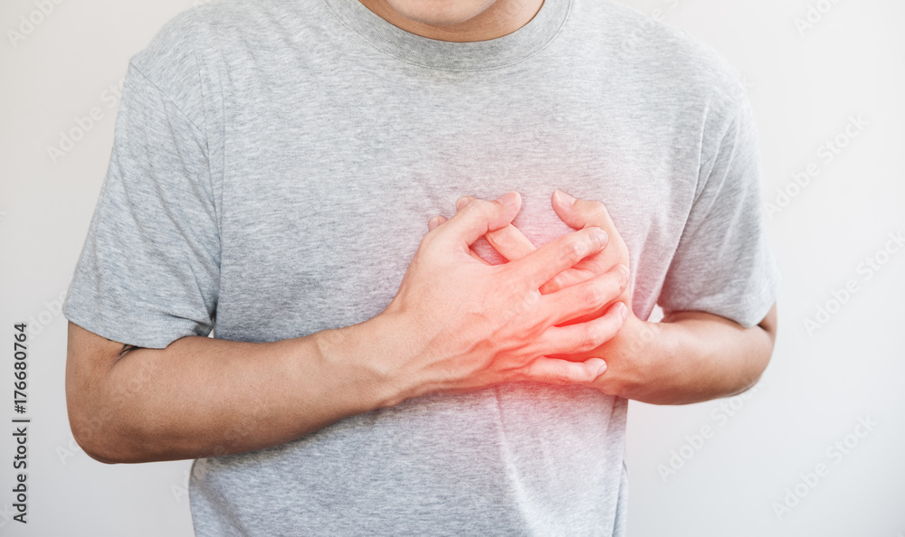 a man touching his heart, with red highlight of heart attack, and others heart disease concept, on white background