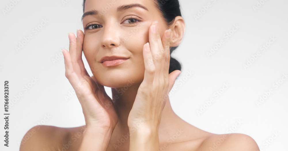 Beauty Concept with Woman Massaging Cheeks and Radiant Natural Skin